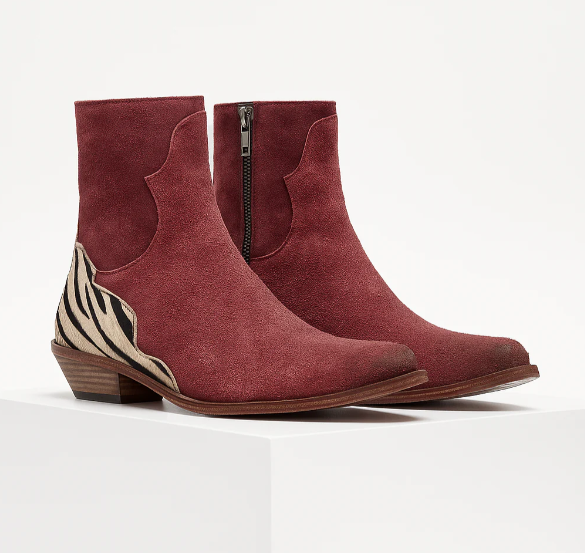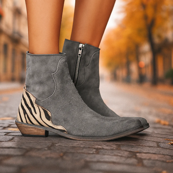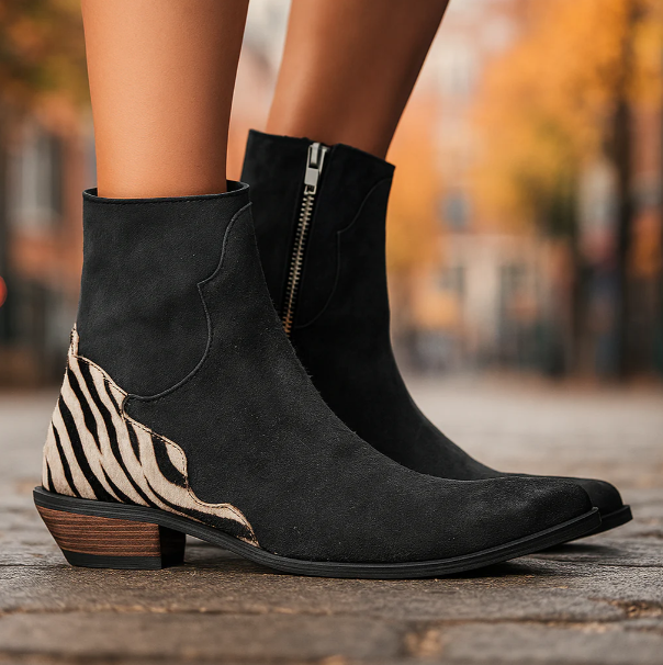 Dettagli distintivi: l’inconfondibile pannello di contrasto con stampa molto accentuata (effetto zebra) sul retro dello stivale dona un tocco audace e moderno, perfetto per chi ama distinguersi con classe.